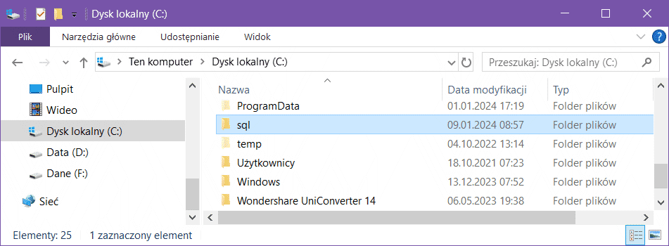 Najpierw przygotujemy na dysku katalog na pliki danych. Otwórz Eksplorator plików i w głównym katalogu dysku C: utwórz katalog C:\sql: